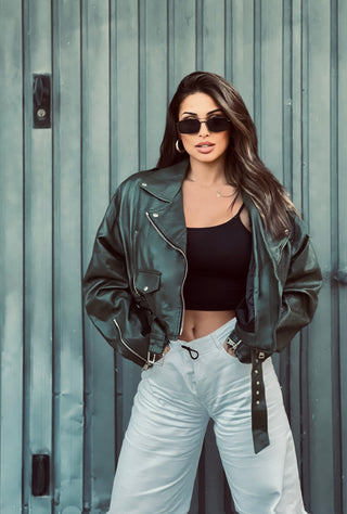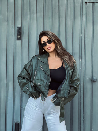 Chiodo biker over short in pelle verde